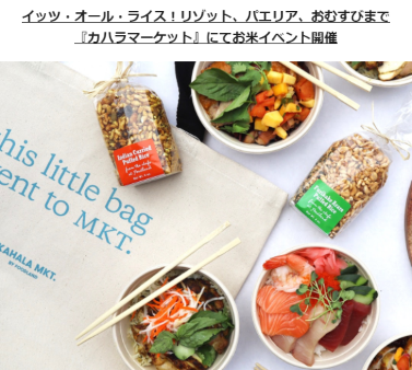 <カハラマーケットで、8月4日(水)から8月28日(土)まで、フードステーションやグラブアンドゴーセクション、ベーカリーに至るまで、お米をテーマにした様々な商品を展開する「イッツ・オール・ライス」イベントを開催する。>
