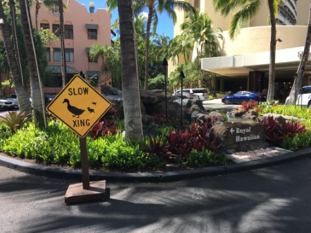 シェラトンワイキキの車寄せの真ん中に小さな庭があってここに時々鴨の親子が居ることはしってたけれど、いつからこんな標識が立ってるんだろう!?