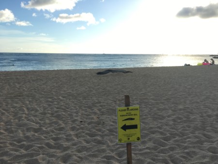 「ハレコア・ホテル」前のビーチに誰かが作った黒い砂山?と思って見てみたら、ハワイアンモンクシールがお昼寝していました。