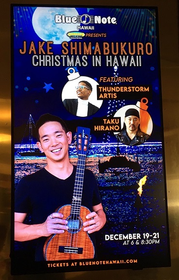 12月19日、20日、21日の3日間、アウトリガーワイキキ2階のブルーノートハワイで「ジェイク・シマブクロ」のライブが開催されるというので、行って来ました。