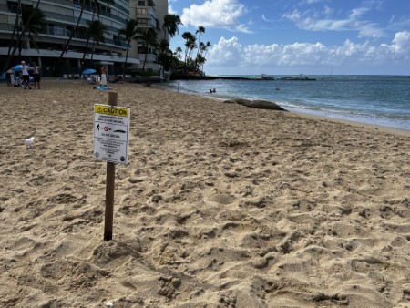「モンクシールに近づくな!」の立て看板の向うにモンクシールを発見!!