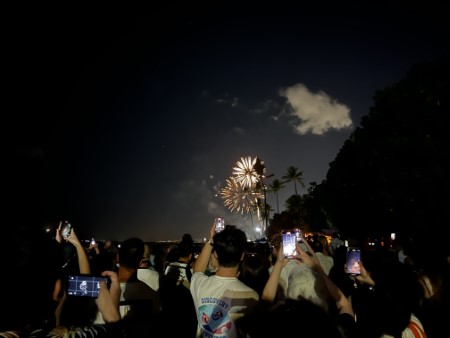 いつもは、自分のコンドから鑑賞するのですが、久し振りにワイキキビーチまで出て行くことにしました。