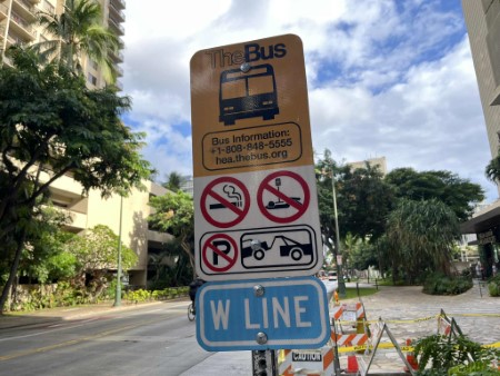 クヒオ通りの市バスのバス停に「W LINE」のサインが追記